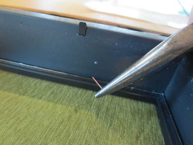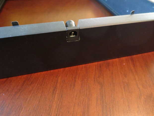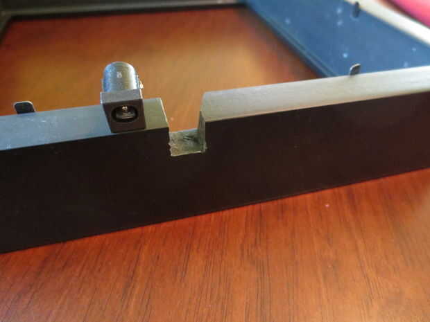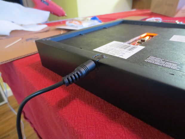 Este marco particular se compone de una carcasa de compuesto y plástico de espuma, lo que es fácil fácil para cortar con un cuchillo de la manía. Utilice herramientas apropiadas para su marco para cortar una muesca en la parte inferior central, sólo lo suficientemente grande como para sostener firmemente el conector de barril. Epoxy realizará a la toma en mucho mejor que el pegamento caliente.