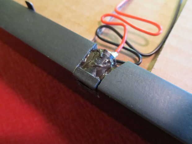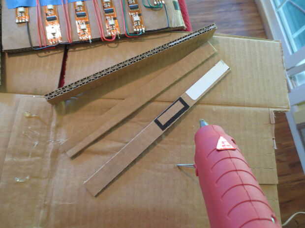 A menos que las tiras de plástico son el espesor correcto para separar el vidrio y LEDs, reemplazarlo con unas tiras de cartulina como en la imagen. No pegar en todavía; será más fácil abordar la toma de barril con el cristal es removido.