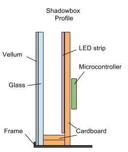 - La distancia entre las tiras de LED y la vitela establece el tamaño de los puntos proyectados. Más espacio puede ser visualmente más atractivo pero deje espacio para el microcontrolador.