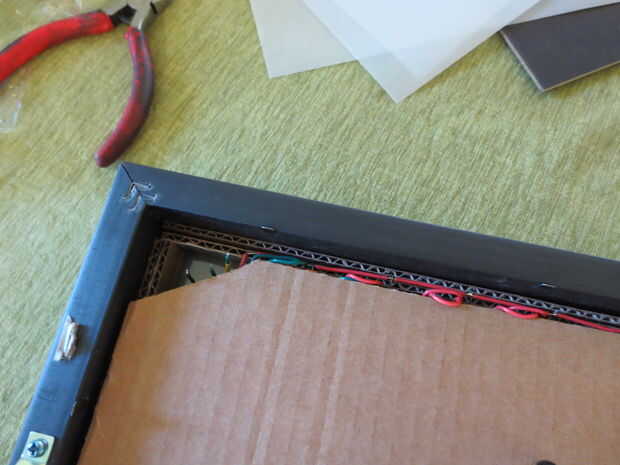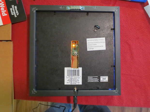 Si desea que la matriz sea fácilmente reprogramable, corte una ranura en la parte posterior para proporcionar fácil acceso al microcontrolador. Las dos últimas imágenes muestran el cuadro montado completamente.