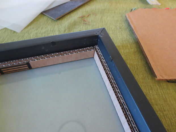 Limpiar la carcasa y el vidrio, luego comenzar a armarla. Coloque la vitela y de cristal en la caja, luego virar en los espaciadores de cartón con pegamento caliente. Coloque los LEDs en la parte superior los espaciadores y mantenerlo en su lugar con pegamento caliente más. Finalmente cerrar apagado con el respaldo original de la caja de la sombra.