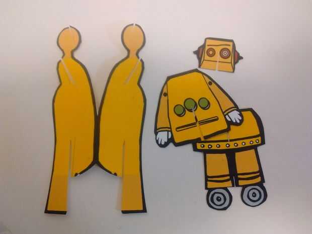 Desarmar tu robot de papel. Poner la cabeza, brazos y pedazos de la pierna a un lado por ahora.