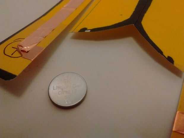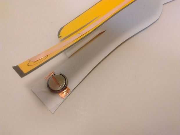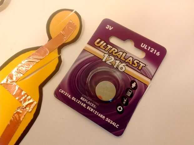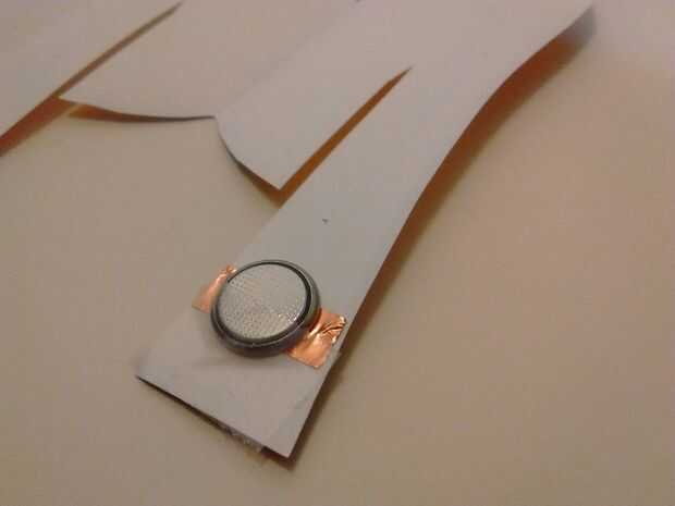 Use un pequeño trozo de cinta para pegar el lado plano de la batería en el interior del lado positivo de la base.