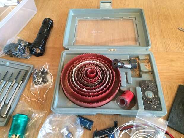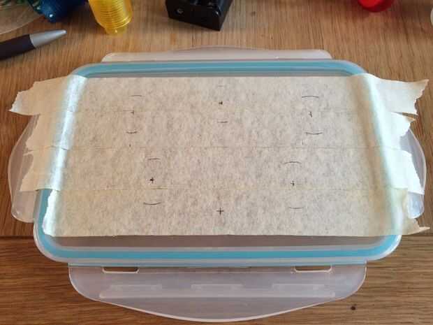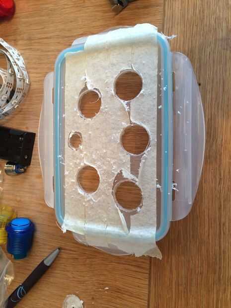 Empecé colocando cinta adhesiva en la tapa y marcando donde quería que los botones colocados. Esto ayuda a evitar daños en la tapa, así como hacer más fácil crear los agujeros del taladro no resbale tanto. Usé un set de cortador de orificios que recibí de mi padre hace un tiempo que trabajó excelente. Aplican demasiada presión en una pequeña sección así que terminó con un leve crack pero nada importante en absoluto. Esta era la trampa de la caja de tupperware.