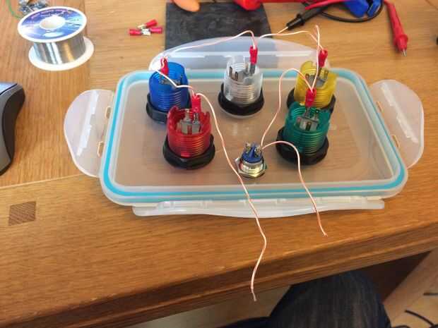 Originalmente trató de soldadura directamente en los pines de los botones pero encontré que esto no funcionó demasiado bien. Después volver seguido y quitar la soldadura de las uniones y compró un paquete de espada engarzado conectores junto con una herramienta opresora. el trabajo de conectores grandes aunque tengo que decir que no estaba impresionado con la herramienta, en la reflexión que deseo fui para una mejor herramienta de estilo ya que era un dolor para conseguir una buena conexión. El alambre que usé era de un viejo cable cat5. Si bien es solo para señales funcionó ok pero como es tan fina que no había mucho para prensar en. Compré un paquete de 100 conectores así que estoy listo para hacer una segunda o utilizar en otro proyecto.