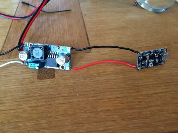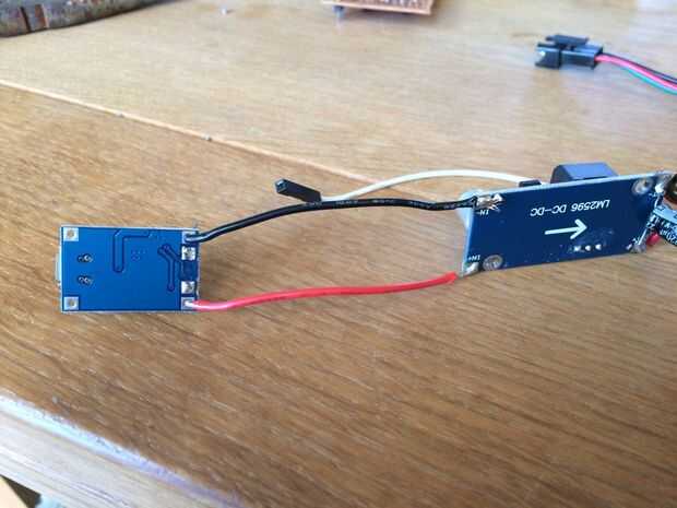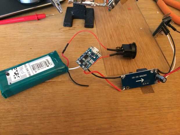 Como muchos de los cables de señal habían sido atado con alambre para arriba ahora y conectado a arduino era sobre cómo iba a la caja de alimentación. Había comenzado a seguir los pasos de los ejemplos anteriores y poner un TP4506 cargador lipo basado enganchado subió directamente a una batería de lipo. Esto utiliza un convertidor del buck para bajar el voltaje de 7.2v hasta 5v. Esto habría funcionado bien había no logré corto soporte de la 18650 batería sólo dual antes por cables hasta el interruptor de entrada incorrectamente y destruirlo!