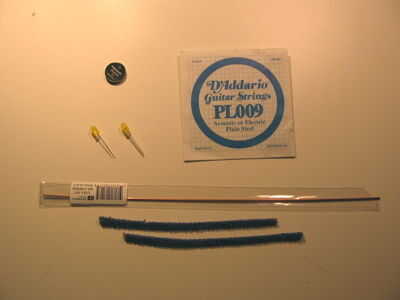 LEDs pueden encontrarse en cualquier lugar en el webernet y son realmente bastante baratos en Radio Shack si (y sólo si) usted compra el paquete de la variedad. Se pueden obtener las pilas de moneda en su tienda local de drogas, y también están disponibles ampliamente en línea, tales como en DigiKey. Usted debe ser capaz de conseguir "singles" de las cuerdas de la guitarra en cualquier tienda de música. Los limpiapipas se puede encontrar en tiendas de tabaco y artes + Artesanias proveedores.
