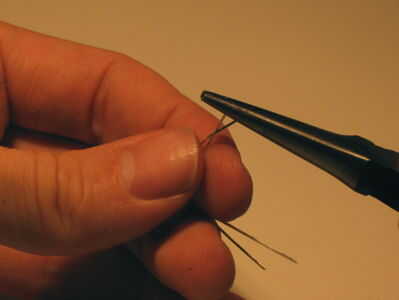 A continuación, cruzar los extremos de cada cátodo, agarrando los extremos con unos alicates. Gire como una ligadura, dando 3 o 4 vueltas. El LED debe permanecer apuntando en más o menos la misma dirección, y los ánodos deben permanecer aproximadamente paralelos. Los LEDs deben ahora ser firmemente torcidos juntos. Si parece que tiene un poco de meneo, dar la parte torcida un apriete con los alicates. Machaque bien.