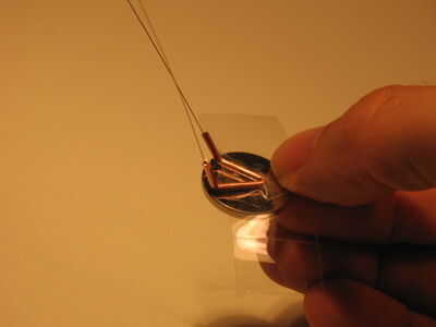A continuación, mantenga los cables de torcido de la Asamblea de LED a lo largo de la parte "inferior" de la batería (enfrente de donde se unen las antenas). El LED debe apuntar en la misma dirección que los brazos de la «V», y los ánodos de bucles deben extenderse "hacia arriba" (es decir, en la dirección del lado "+" de la batería). Envuelva firmemente la cinta alrededor de la batería entera, para que todo se lleva a cabo firmemente en lugar.