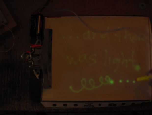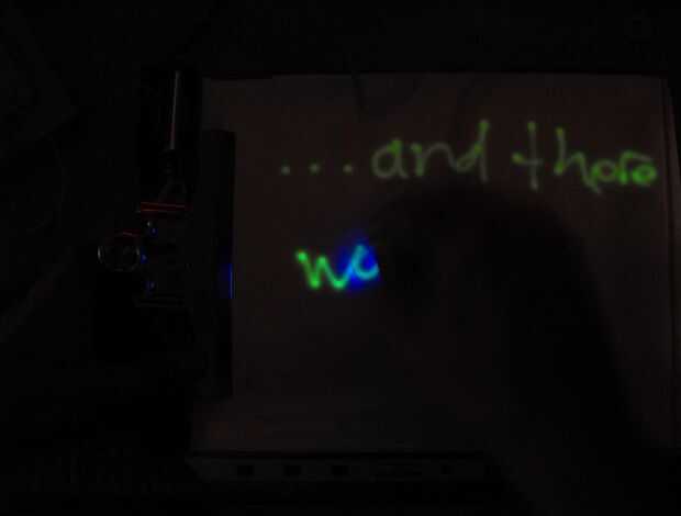 Devuelta a pocos minutos los fundidos de material Gita en equilibrio con la luz/oscuridad ambiental. Los dibujos no duran, a menos que tomar una foto de ellos, y eso es algo complicado porque hay que hacerlo con poca luz. Una foto de unos garabatos "guardados" se unen a esta introducción y paso 13 que explica el truco para sacar estas fotos. (Nota: si flash de la cámara se apaga, la inundación resultante de luz blanca borra el dibujo. Por lo tanto, imágenes de doodles fosforescentes se debe con función de flash de la cámara apagada.)