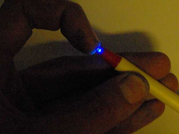 Otro truco es apropiado un LED azul en la punta del cuerpo de lo que solía ser un bolígrafo. Como una complicación añadida quiero el LED se encienda sólo cuando se presiona contra la almohadilla. De esa manera "marca" de la misma manera que un bolígrafo o lápiz, que marca sólo cuando presiona contra el papel. Si el LED está siempre encendido, conseguir un efecto que es más como de la aerosol-pintura, y que no es el efecto que quiero.