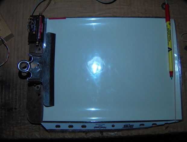 Cuando pongo todos estos elementos juntos: hoja de Gita, plus portapapeles, además de protector de página, además de LED azul, hackeado módulo del controlador de LED, además de interruptor de presión actuada... el resultado es el Bloc de notas fosforescentes.