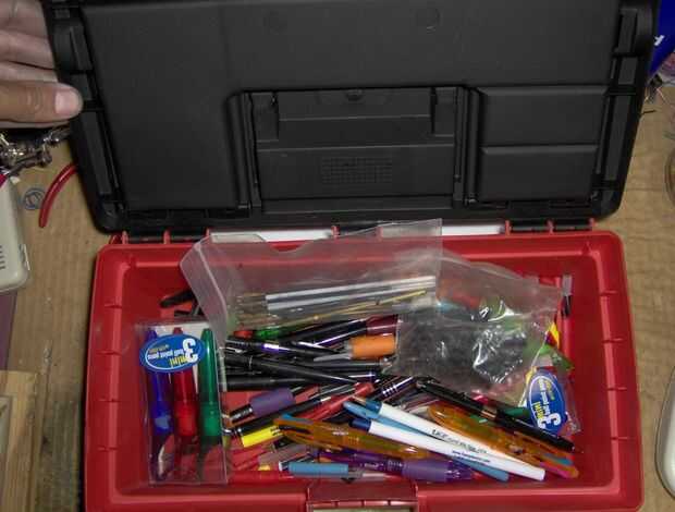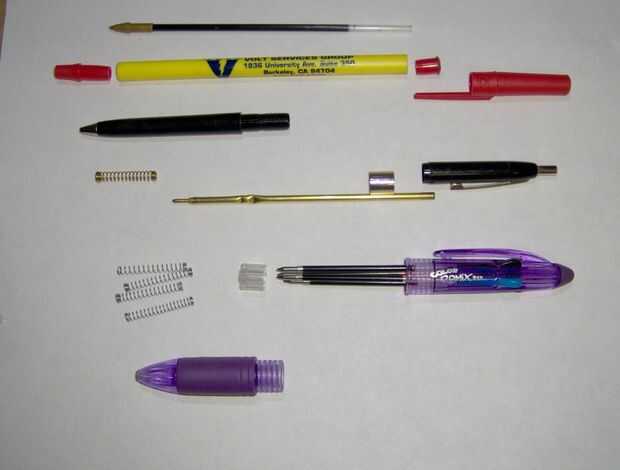 El otro ingrediente vital es un manantial, de la clase encontrada en bolígrafos clicky clicky, retráctiles. En la primera foto se muestran algunos ejemplos de estos. Sólo la primavera es necesario, y lo siento si parece un desperdicio. No es como realmente desechar nada. Todas las partes de la pluma que tengo obtengan lanzó juntos en un plástico rojo, caja de herramientas, que se parece a una fosa común espeluznante para bolígrafos. Está en la última foto.
