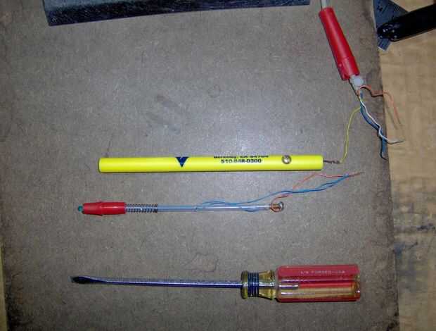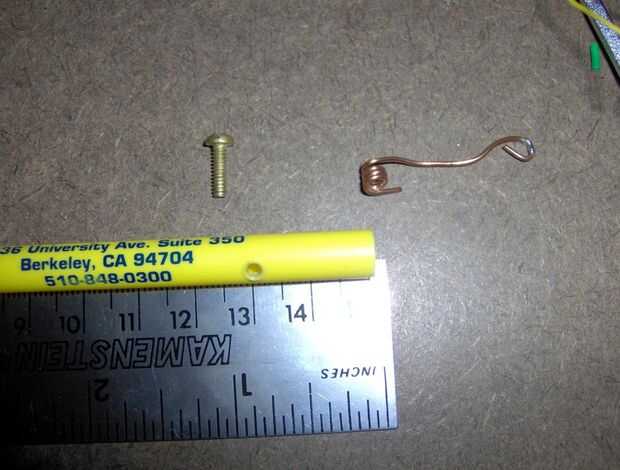 La segunda foto muestra lo que el eje de la realidad parece: en un extremo y un contacto de interruptor tornillo de latón en el otro extremo. Los cables de calibre fino (30 AWG) azul van al LED. El interruptor de contacto, en el eje, tiene un cable naranja soldado a él.