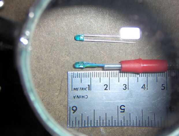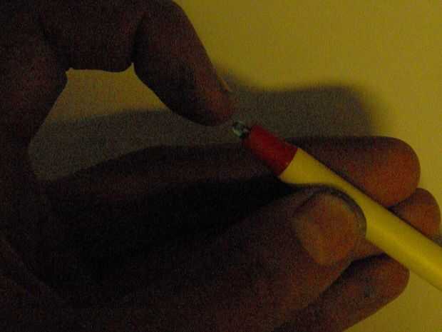 La primera imagen aquí muestra un LED azul Virgen, al lado de uno que ha tenido su lleva recortado y en forma de modo que puede ser presionado en la varilla de plástico que solía ser un cartucho de tinta.