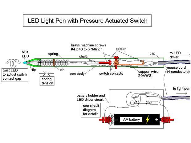 La primera es una vista seccional de las interioridades de la pluma de emisión de luz, explicando el mecanismo del interruptor dentro de la pluma.