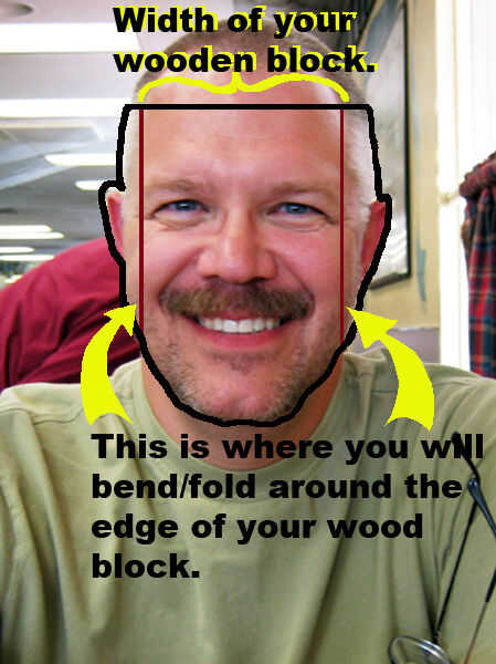 El bloque de madera es una pieza de 2 X 2 que fue alrededor de 3 1/2 pulgadas de largo.  Tomé una foto que tenía una vista buena cara completo impreso en papel normal. Me aseguré de que la distancia desde fuera del ojo para fuera de los ojos era el mismo que mi ancho de madera. Ápice este tamaño en mente era capaz de doblar las orejas sobre el lado del bloque.