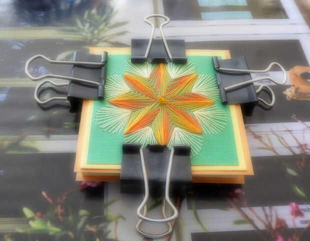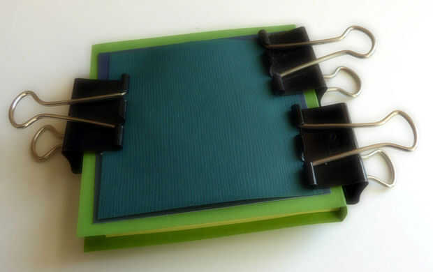 Hago muchas de ellas a la vez, así que no puedo sostener cada uno hasta que esté lo suficientemente seco como para liberarlo. Utilizar clips binder presionado los bordes pegados. Si usted está teniendo problemas para conseguir el pegamento para adherirse a lo largo del borde superior de la almohadilla de Post-it, empuje un par de clips de la carpeta lo más cerca posible a ese borde.