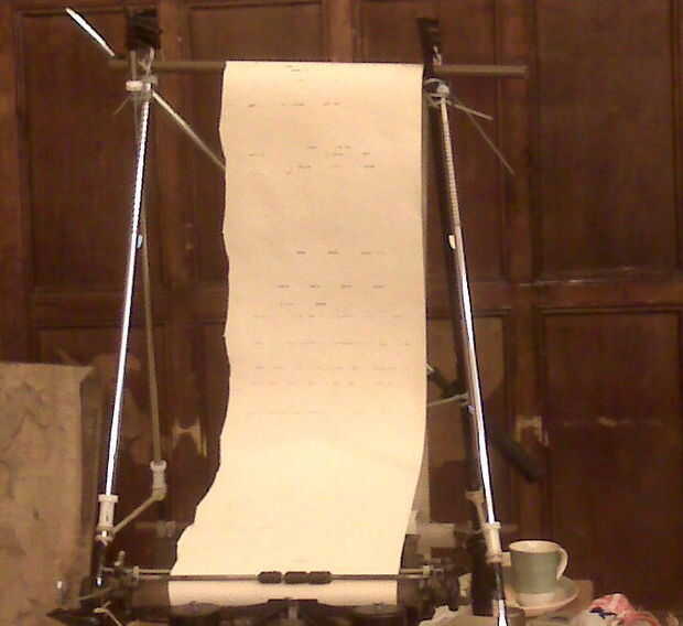 La parte inferior la barra transversal en la parte posterior y lleva el rollo de papel, lista para alimentar a la máquina de escribir.