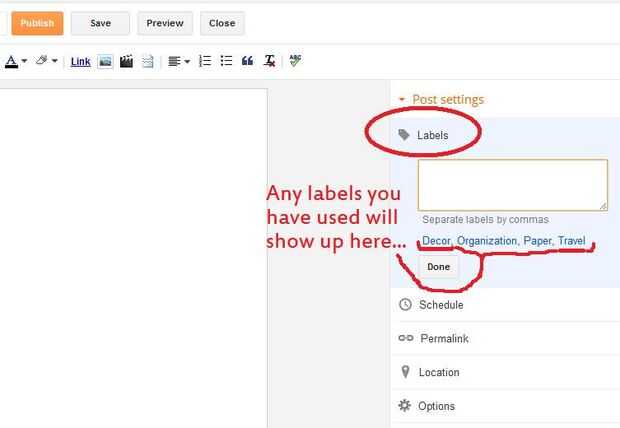 En el lado derecho del editor de post nuevo, seleccionar "Etiquetas" en la configuración de correos. En el cuadro Abrir, puede añadir las etiquetas que desee asociar con el post del blog, pero te recomiendo que uses una de las etiquetas de palabra. También tenga en cuenta que la capitalización de la etiqueta afectarán a su capacidad de búsqueda. Si ha creado un enlace de "...com/search/label/instructables" en el paso 2 o 3 paso pero etiqueta de tu post "Instructables" no va a funcionar bien. Cualquier etiqueta que has usado previamente debe aparecer en el cuadro de entrada, haga clic en una etiqueta usada anteriormente es la mejor manera de hacer las cosas bien.