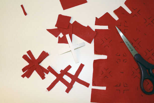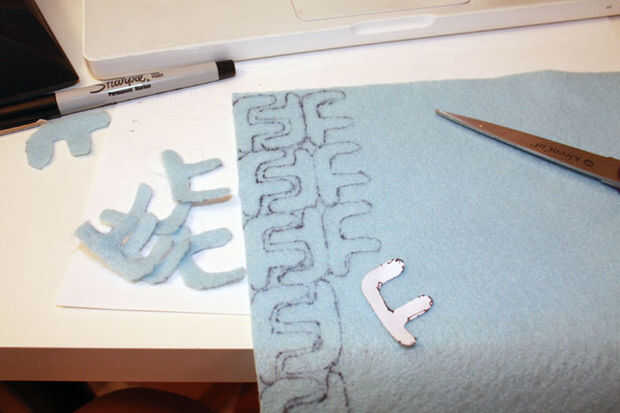 Corte hacia fuera su icono de papel y trazar en sharpie en el fieltro. Es una buena idea para colocar las formas juntas para conservar el material en caso de que necesite más. Trazar tantos iconos como quieras tener total.