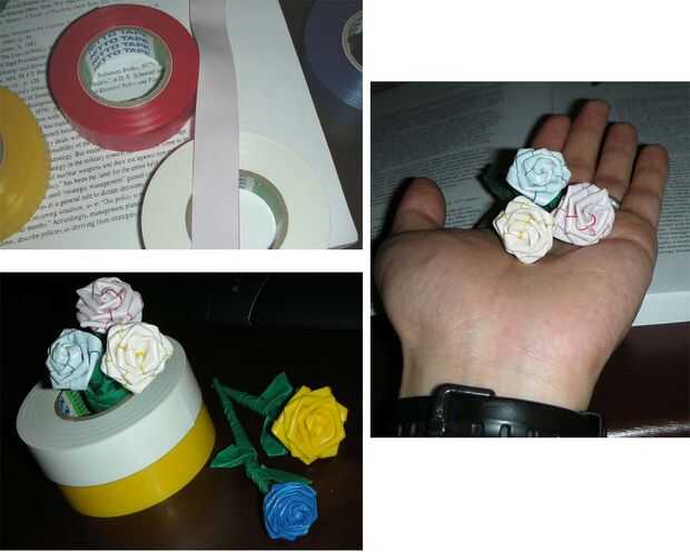 En esta etapa puede cortar la cinta sobrante y pegar otra tira de cinta aislante verde hasta el final para hacer un tallo. Simplemente enrolle la cinta aislante verde hacia abajo progresivamente. Se puede ver en las flores diferentes de imagen de esta manera. Los colores pastel hicieron wedgeing un color de la tira entre dos blancos. Sin embargo, usted termina con una cabeza mucho más gruesa. El azul se hace de una franja de chamuscar y el amarillo está hecho con dos tiras pegadas según el paso uno. Electrcal cinta realmente es perdonar tan juego alrededor hasta encontrar algo que se adapte.