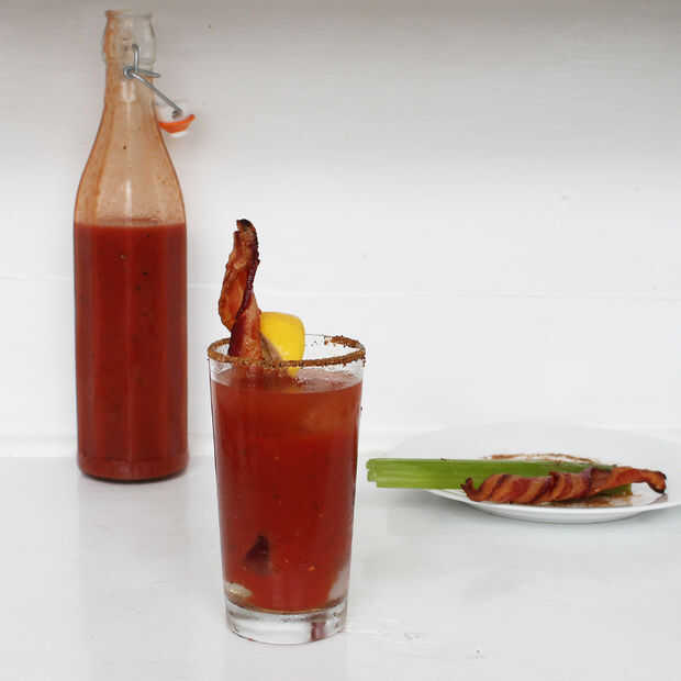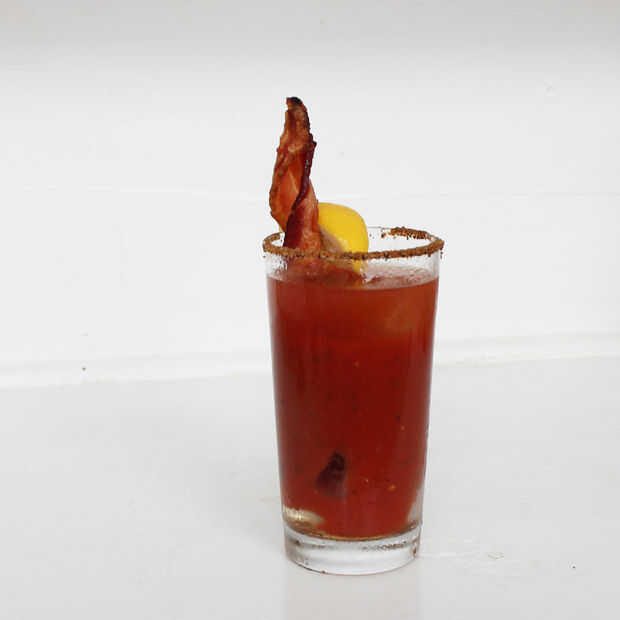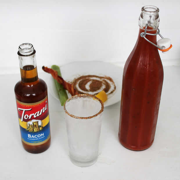 - Llene la coctelera con hielo y agregar el vodka, jugo de tomate, jarabe de tocino y jugo de una cuña de limón.
