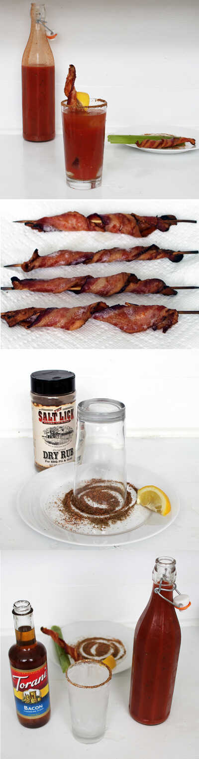 - Guarnición: 1 palo de apio, 1 cuña de limón, 2 aceitunas, espárragos en vinagre, vuélvase loco. Y no olvide el tocino!