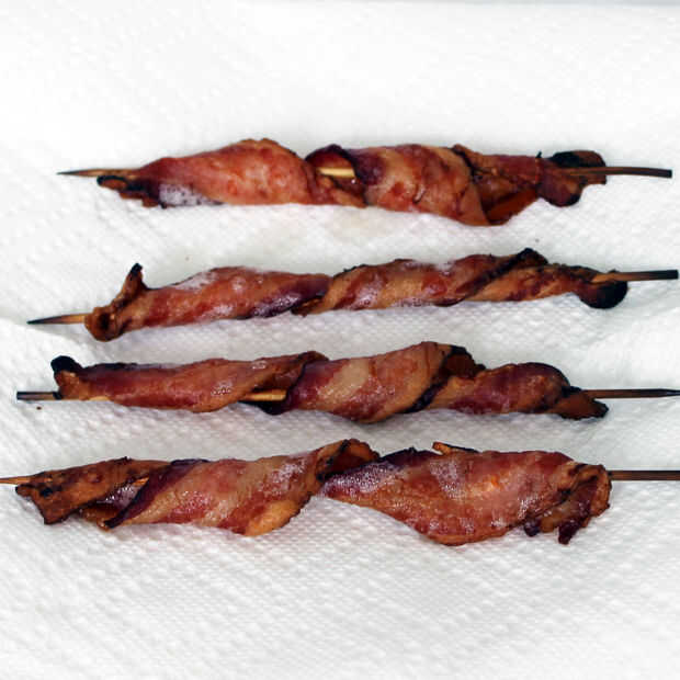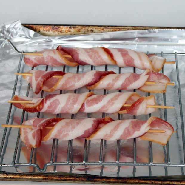 - Pedazo de un extremo del tocino con un pincho. Enrolle el tocino alrededor de la brocheta y perforar el otro extremo.