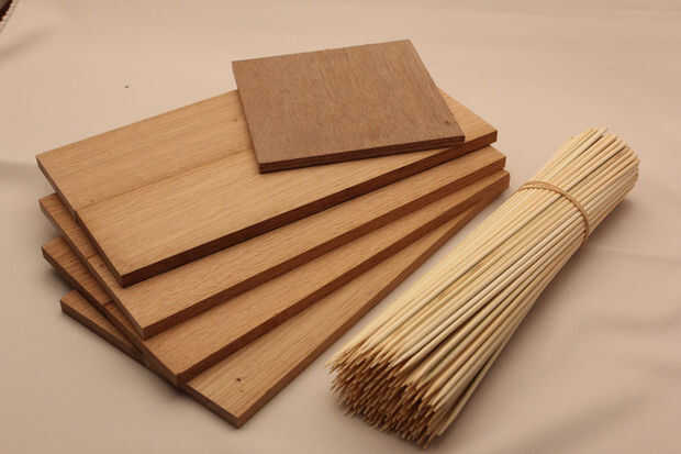 4 piezas de 255 mm * 140 mm * 9 mm (10 "* 5,5" * 3/8") en madera sólida agradable (yo usé de roble), estos serán los laterales de la caja