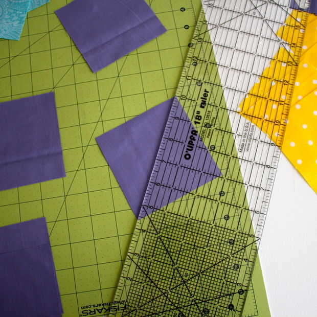 Para cortar los cuadrados de 4 x 4 pulgadas en triángulos, simplemente alinee una regla de esquina a esquina y cortar con el cortador rotatorio.