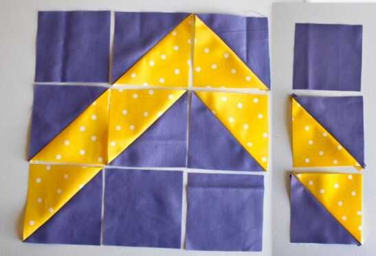La mitad triángulos cuadrados son otra subunidad importante en la fabricación de bloques de la colcha y colchas. A media cuadra de triángulo cuadrado es un cuadrado hecho de dos telas diferentes, para que cada tejido forma la mitad de la Plaza unien