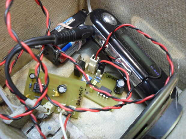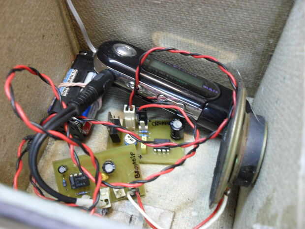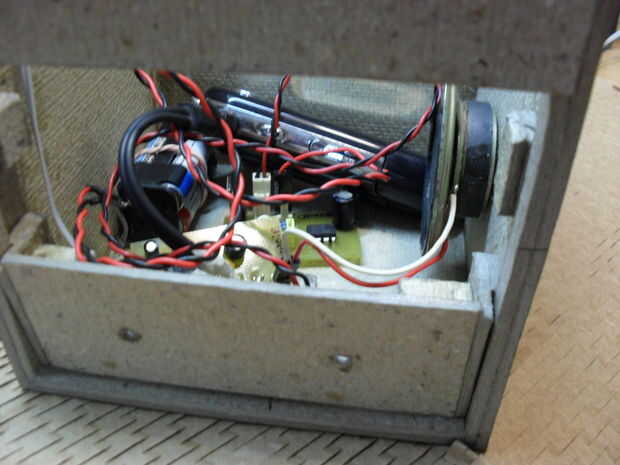 Ponerlo todo dentro de la caja. Sólo se unen la batería y el altavoz, otras cosas pueden estar flojos.