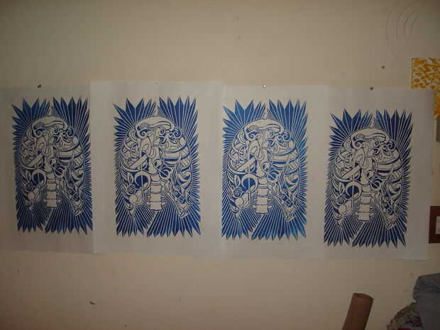 si imprime una impresiones de color, bien, cortar el bloque de linóleo, golpear un pedazo de papel sobre él, recorte el papel y listo.Si usted quiere hacer la impresión de múltiples bloques, tienes que tener alguna manera a la línea del borde del pap
