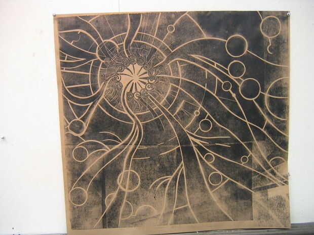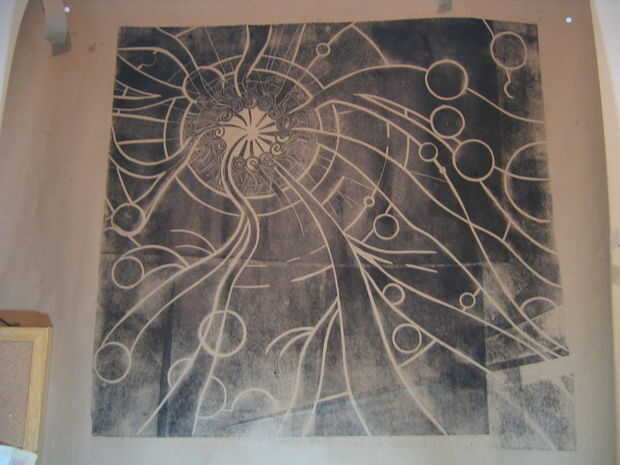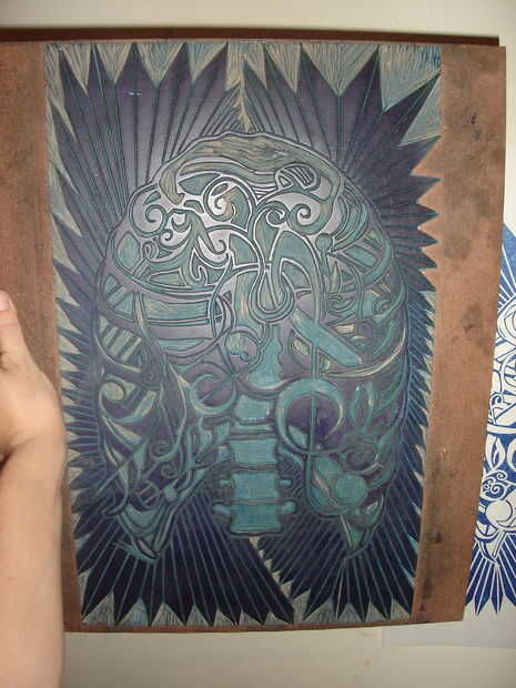 Presione suavemente (utilice un rodillo o usar la parte posterior de una cuchara de madera y frotar suavemente sobre el papel), pero no mueva o toque el bloque - si usted tuerce, el diseño será manchar.) También puede utilizar una prensa si tienes acceso a uno. Leer las instrucciones porque cada tecla es diferente y que son caros y no quiere arruinar a uno. Se trata de conseguir la tinta transferida al medio.