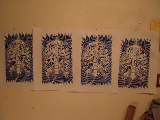 Mira el diseño y si eres feliz con ella le dan unos 3 a 4 días secar para estar seguro. Tinta de aceite lleva un tiempo para secar. No apile las huellas hasta que se secan completamente. Colgándolos funciona mejor para mí que se quedan fuera del camino. Sugiero más tiempo de secado para las telas alrededor de 1 semana.