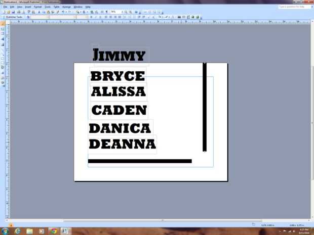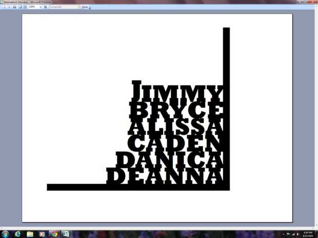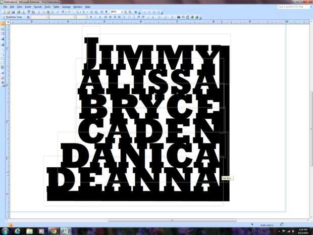 Esta es que la plantilla en caso de no saber lo que era por su propia cuenta. Esto es lo que se pegue en la pieza de madera por lo que se puede cortar con más precisión. Así que puede hacer esta parte sin embargo desea como parece que el producto final, pero se trata de cómo la hice. Hice en Microsoft Publisher, y comenzó haciendo recuadros individuales para cada nombre, había organizado de menor a mayor, empalmados los nombres con un cordón e imprime. Tamaño de la fuente era de 72, y la fuente sí mismo fue llamada Rockwell Extra Bold. Te dejo que figura de alguna de ajuste fino de la plantilla porque es diferente con todos mis proyectos.