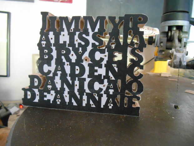 Después de taladrar empiece a cortar otra vez. Para ello, desenrosque la cosa de la abrazadera que sujeta la parte superior de la hoja en su lugar e Inserte la parte superior de la hoja hacia arriba a través del agujero que es perforado anteriormente. Reclamp la hoja y empezar a cortar. Una vez que haya terminado con la sección que hace soltar la cuchilla, tire de la pieza de madera hacia fuera y vuelva a insertarla en un agujero nuevo. Este es el paso más largo de mi instructible. Yo recomiendo escuchar algo de buena música (libre y no pirateados en el enlace), tal vez un libro en CD, o sólo sentarse en silencio y cortar madera. Este paso es también la razón de por qué no se puede utilizar una sierra de banda. Nota: como se corta el proyecto no parecerá tan agradable. No estoy muy seguro por eso se ve tan mal como cortarlo hacia fuera, y puede ser un poco deprimente, pero pasar. Se ve mucho mejor después de que la arena.