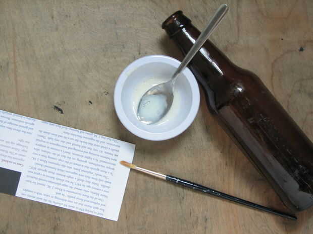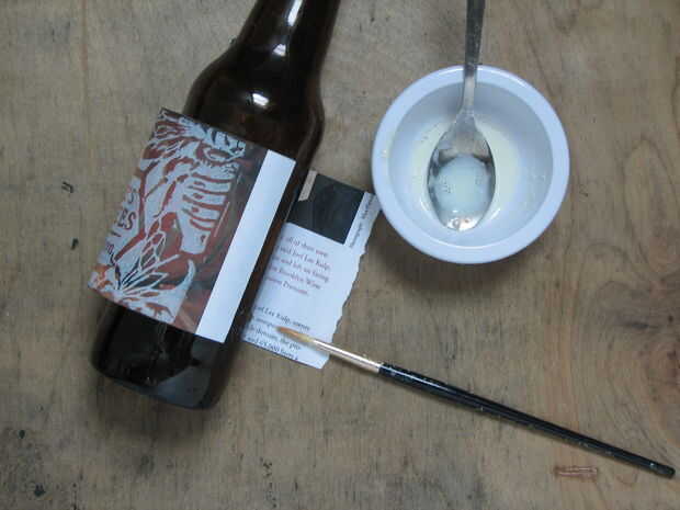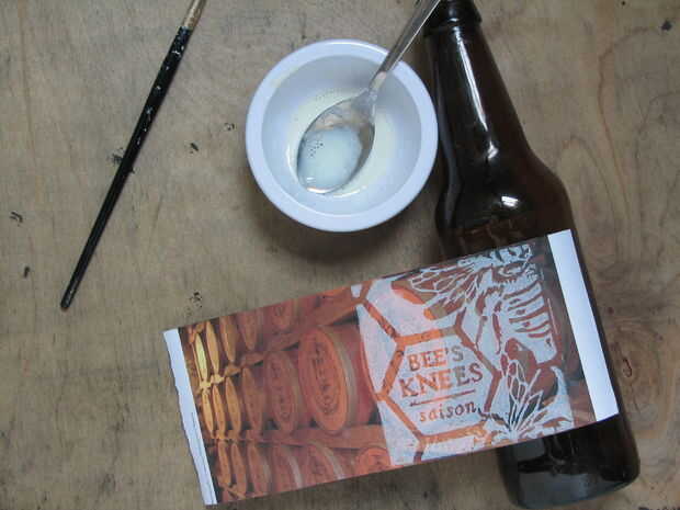 Una vez que las etiquetas se imprimen y secadas (oh, y la cerveza es elaborada, preparada y envasada) usted puede colocar sus etiquetas. En un tazón pequeño mezcle leche de 1 T. en polvo con 1 T. agua. mezclar los dos hasta que no queden grumos. Cuanto mayor sea el área que se aplica pegamento, el firme se encuentra la pegatina. Pero aplicar el líquido a un área más grande también hará más difícil mantener el papel de pandeo y deformaciones. Así que tienes que encontrar un equilibrio para su proyecto. Encontré aplicando el pegamento a una franja de media pulgada a cada lado de la etiqueta mantuvo firmemente en su lugar y no era demasiado difícil de aplicar sin problemas. Suave con cuidado el papel sobre el cristal hasta que se adhiere (pocos segundos). Ahora suave el resto de la etiqueta, enrollándola alrededor de la botella. Pintura pegamento sobre el reverso de la etiqueta y pulsado el ello a través de la botella hasta que se adhiere. Voila! Para quitar las etiquetas, sólo tienes que remojar las botellas en el agua y el pegamento se afloje y lavar fácilmente.