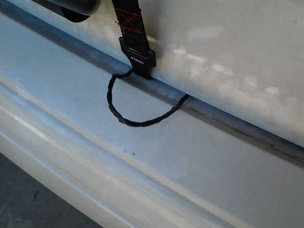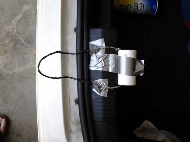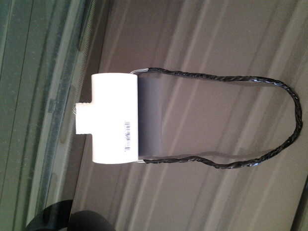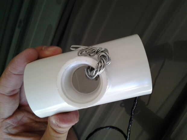 Para este paso, simplemente tomar tantas hebras de alambre como se sienta hace su forma segura y girar en un solo cable múltiple trenzado grande usando sus pinzas. He utilizado cuatro filamentos por lo que el tronco no tendría ningún problema de cierre. Usted debe usar más fino, estaba siendo conservador. De todos modos, tome el cable grande y cada extremo a través de los extremos opuestos de la t de PVC del hilo de rosca y alimentarlos a través del medio apertura. Desde aquí, liberalmente (y me refiero a liberalmente) tuerza los extremos. La seguridad de su bicicleta depende de ello. Después tienes la t y el bucle del cable todo reunido, puede envolver el alambre con cinta aislante (o la cinta de su elección) para ayudar a proteger el tronco de los arañazos y el cable de los elementos. La cosa entera ahora puede ser grabada en el interior de su tronco. He utilizado cinta adhesiva para conductos. El objetivo principal aquí es la cinta de la t y el cable hacia abajo para que el bucle del cable puede adecuadamente se peguen hacia fuera desde dentro del maletero. Probablemente alguien podría averiguar una forma bonita de hacerlo, pero funciona. Usted quiere ser capaz de la cadena a través del lazo del hilo de rosca, así que tenlo en mente con su colocación. Básicamente, la idea aquí es que la t de PVC está siendo utilizada como un tapón dentro del tronco para mantener el alambre anclado y seguro.