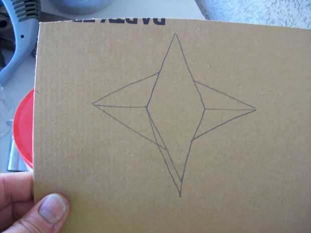 Hice una plantilla de cartón tipo de como el ilustrado aquí. Usé esta plantilla para marcar dos puntos de cada estrella en el metal. Yo solo corte un poco de los otros dos puntos para tener una forma para unir las estrellas para la primavera. Corté las formas con las tijeras.