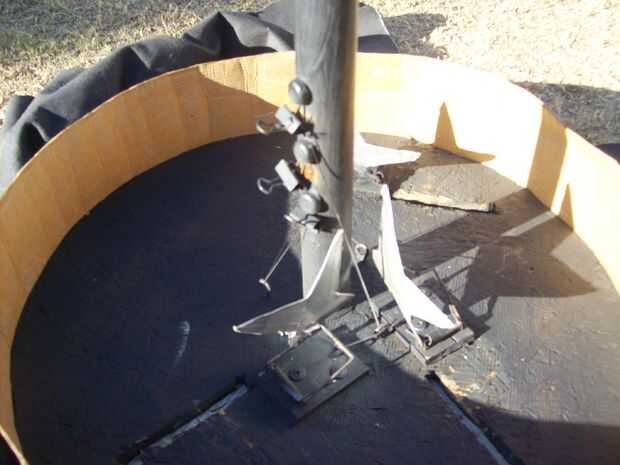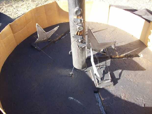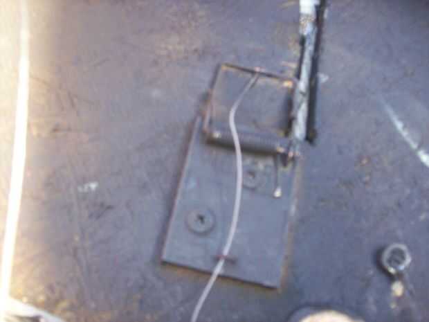 OK, así que los mecanismos están en el lugar y la pata de la mesa está en su lugar con los gatillos. En este punto, ata el sedal a la barra transversal en las trampas. Utilicé la línea de 50 libras. No quiero nada endebles. Funcionó la línea a través del lazo conveniente que brazo de la trampa se utiliza para conectarse. Utilicé tornillos de ojo como se muestra así. Una vez que sabía donde quería las líneas para terminar, simplemente até grandes nudos en la línea de los disparadores para agarre. Funcionó bien.