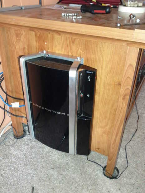 Ya está todo hecho y puede estar seguro de que tu ps3 no se va a ninguna parte. Si eres el tipo de persona que debe ser móvil con tu PS3 entonces puede modificar el diseño con una bisagra en la parte inferior y una sección en la parte superior que pasa a través del gabinete que puede ser bloqueado con un candado de manillar plano.