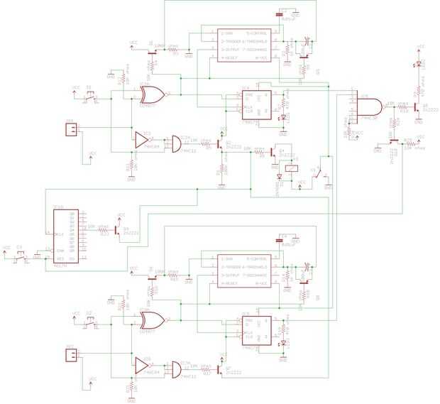 La puerta XNOR, IC2A, producirá un voltaje positivo si las entradas de ambos son iguales. Ahora echemos un vistazo a IC3 y IC1A. Cuando la entrada del IC3 es 0 y la otra entrada de IC1A es 1 la salida de IC1A será 1, que significa la salida de Q2 será 1, que a su vez se enciende Q4 permitiendo que la corriente fluya a través de la bobina del relé que se restablecerá el flip flops. La razón de Q2 es que si todas las salidas de puertas y fueron conectadas al mismo punto, podría causar un cortocircuito si una salida fue 1 y un 0 que destruirían el chip. IC 10 es el contador de década 4017 bien conocido. Cada vez que "desordenar" cuando usted introduce el código, avanza el contador en 1, cuando llega pin 10, Q9 se enciende que bloqueará el teclado. Se puede cambiar cuántos intentos tiene antes el teclado se bloquea al cambiar que pin le conectan la base del transistor a la 4017. Tenga en cuenta que sólo los 555s y flip flops deben ser conectados a conexiones de terminal, el resto de la energía común del relé debe hacerse en VCC.
