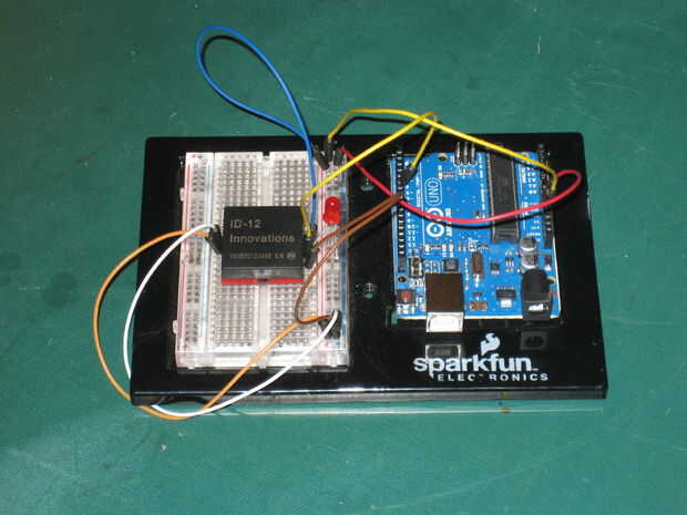 El lector de RFID a la Junta de arranque de la soldadura. A continuación, alambre como sigue: Pin de lector RFID 1 a tierra. Pin de lector RFID 2 a 5v. Pin de lector RFID 11 a 5v. Pin de lector RFID 10 LED. RFID reader 9 a pin Arduino pin 6. Pin de lector RFID 7 a tierra.