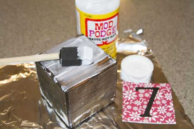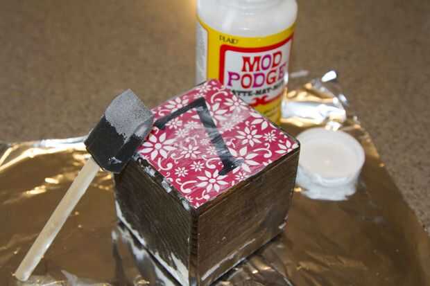 Cubrir la superficie que va a trabajar en con papel de aluminio. Trabajo de un lado a la vez que permite que se sequen antes de girar y trabajar en el lado próximo. Esto tomará algún tiempo para trabajar sobre ellos en un área que puede salir y volver a ellos como se secan. Aplique una capa de mod podge a un lado de un bloque de madera. Tomar su plaza de scrapbook y presiónela sobre el pegamento y céntrela. Una vez que se coloca en el lugar correcto, aplicar otra capa de mod podge. cubriendo toda la pieza de papel de scrapbook. Dejar secar y luego voltear hacia el siguiente y repita hasta que todos los lados están cubiertos.