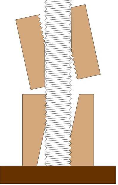 Se hace un bloque de la cerradura de un cubo de 1" con un agujero roscado de anillado-16 en el centro. Agujero de otro anillado"está aburrido en una inclinación de 12,3 º. Lo que hace esto es eliminar la mayor parte de los hilos excepto por un lado en la parte superior y el otro en la parte inferior. Esto permite que el bloque Deslice hacia abajo la varilla del perno y sólo se fijan en su lugar cuando golpea una superficie dura.