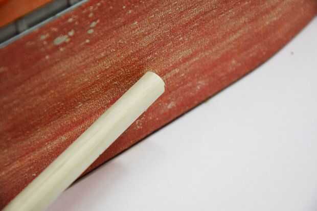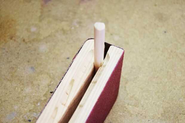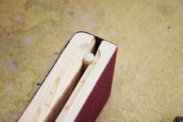 Corte espiga 3/8 de pulgada a 3 pulgadas en longitud. Un biselado en un extremo de la arena. Deslice la banda de papel de lija alrededor del bloque. Debe ser sobre todo apretado mientras se desliza sobre el bloque. Si no encaja, cortar un poco más el extremo del bloque, los extremos del bloque de la ruta y repita como sea necesario hasta que quede el papel de lija. Si el papel de lija está suelto, corte un nuevo pasador con un diámetro mayor hasta que papel de lija está apretado.