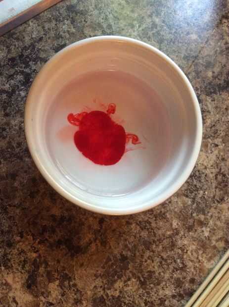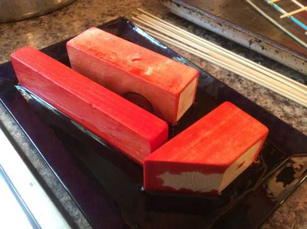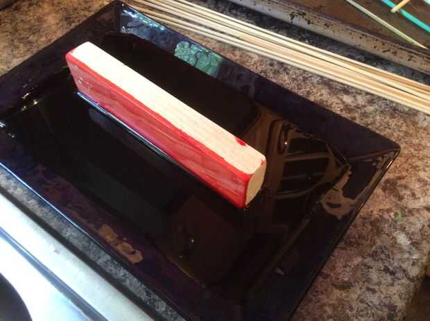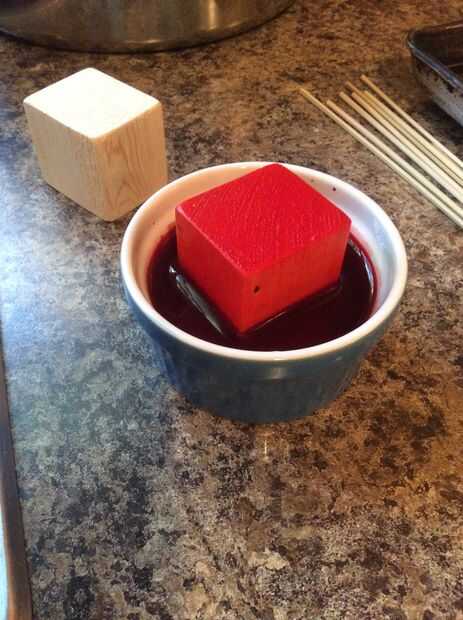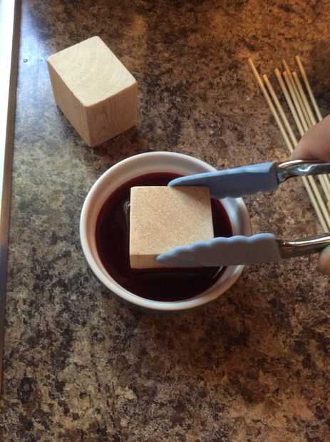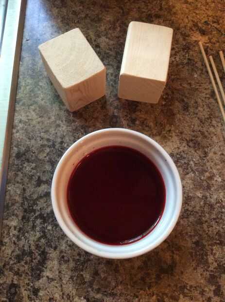 Inmersión en un recipiente con el colorante, un poco como colorear huevos. Dependiendo de la madera, déjalos reposar unos 20-30 segundos. Sabrás que han empapado bastante cuando vea el colorido inicio de evacuación hacia los lados. Girar el bloque como sea necesario para cada lado del color.