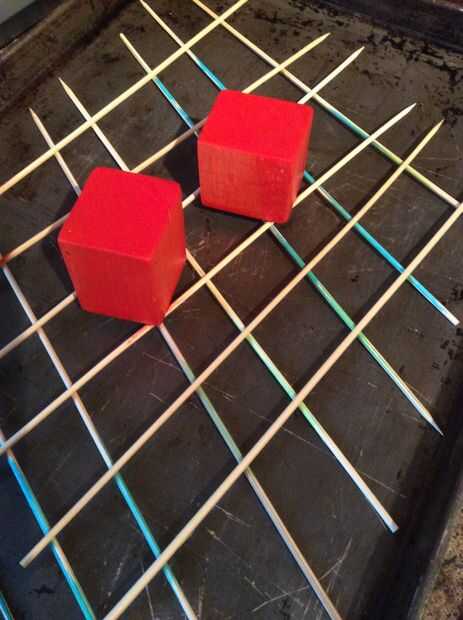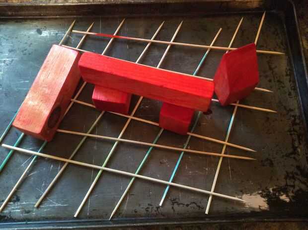 Establecer los bloques en una especie de estante para secar. Hice un estante de brochetas en una bandeja para hornear galletas. Trate de no usar toallas de papel, ya que la toalla se empape y robar su tinte del bloque! Se debe secar color prácticamente idéntico a los palillos de colores.